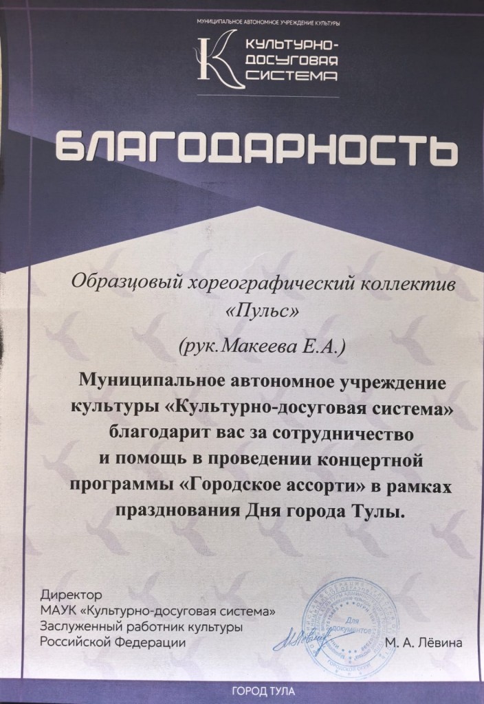 В концертной программе "Городское ассорти", посвященной празднованию Дня Города Тулы! ,принял участие Образцовый хореографический коллектив "Пульс" (рук.Макеева Елена Александровна),