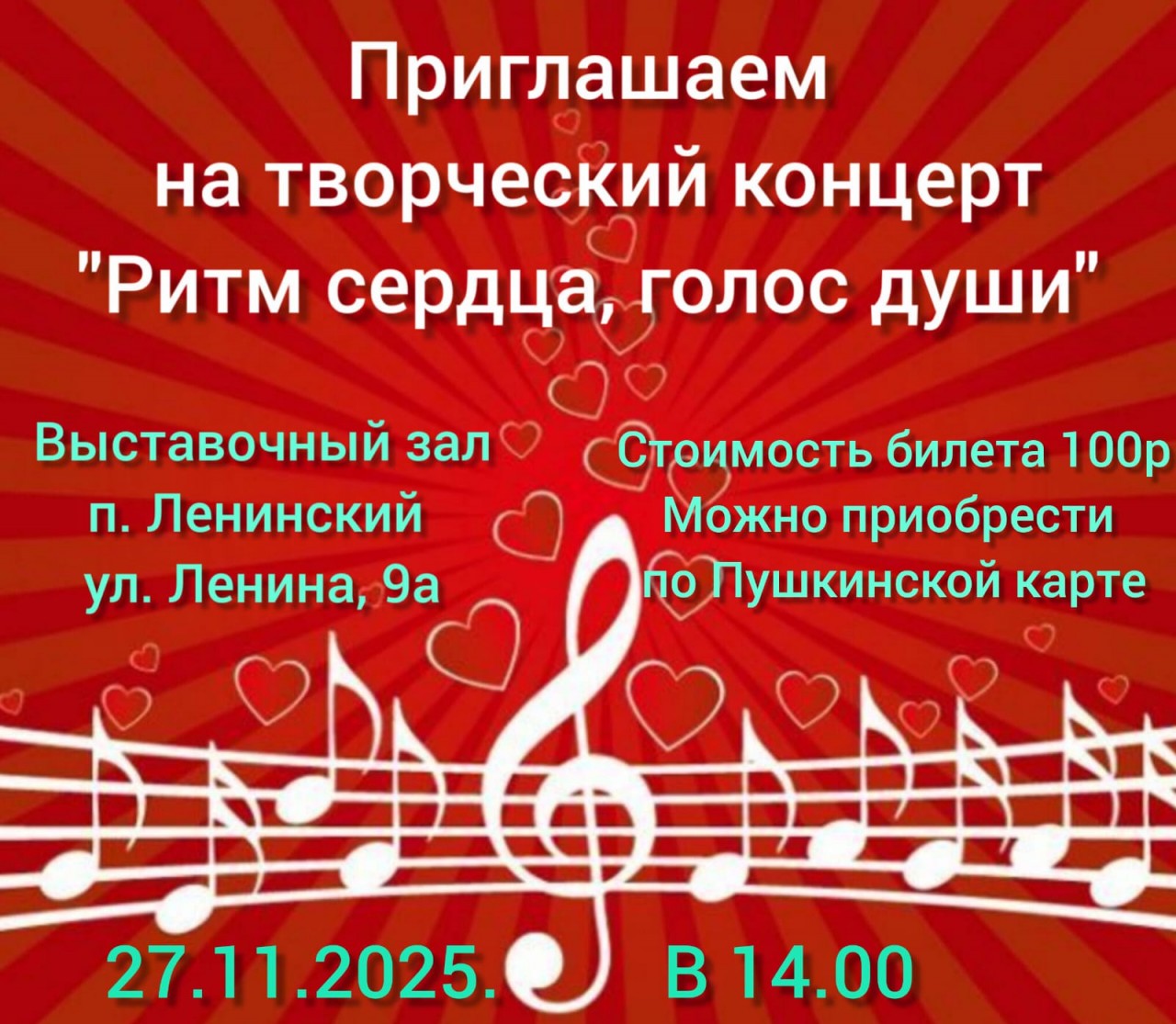 27 ноября 2025 г. в 14.00 в концертном зале Ленинской ДШИ п.Ленинский,ул.Ленина,9А, состоится творческий концерт «Ритм сердца, голос души», участники которого познакомят с музыкальной летописью России, ее душой, воплощенной в звуке.