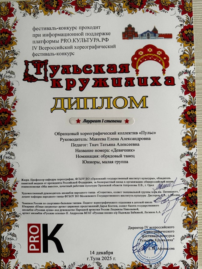 Поздравляем Образцовый хореографический коллектив "Пульс" (руководитель-Макеева Е. А. , преподаватель- Ткач Т.А.) с достойными наградами: