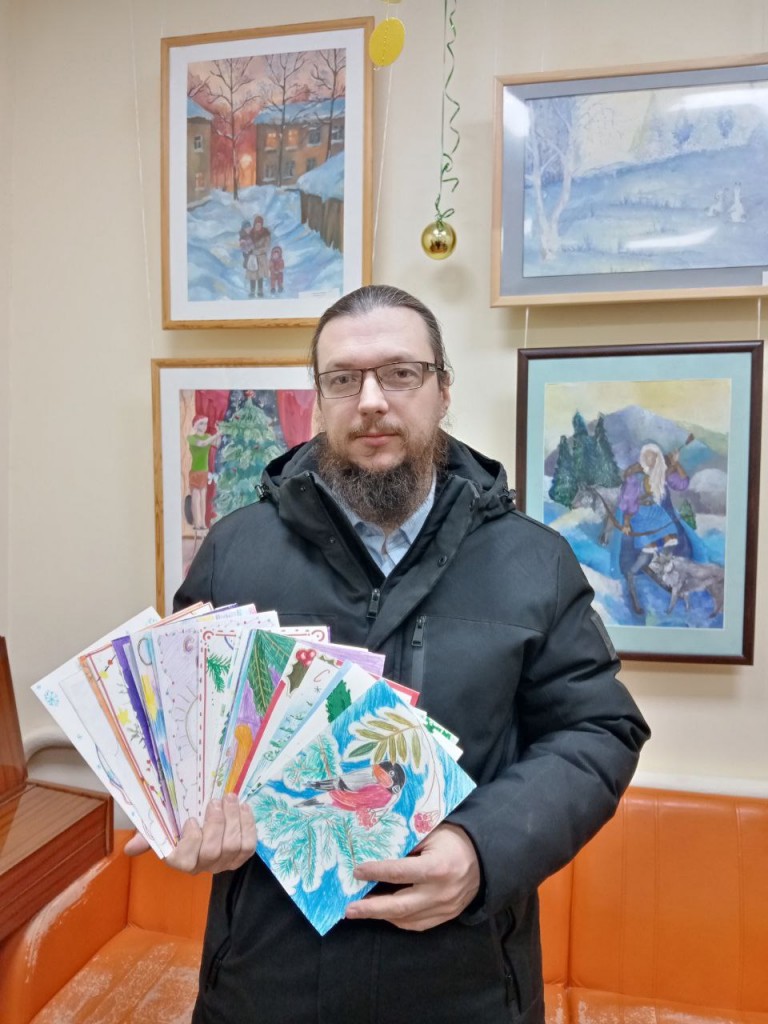 Открытки были переданы иерею Алексею (Мяснову) настоятель Храма Рождества Богородицы село Обидимо, который окормляет госпиталь бойцов СВО г. Тула