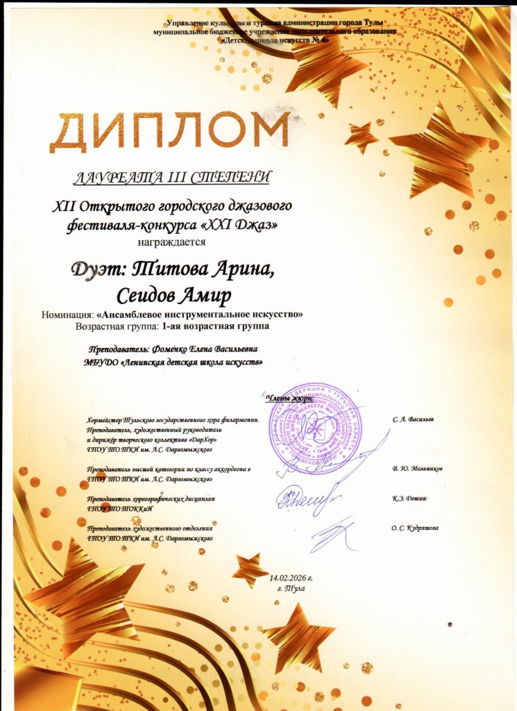 лауреат 3 ст. -дуэт: Титова Арина и Сеидов Амир (фо-но), преподаватель Фоменко Е. В.