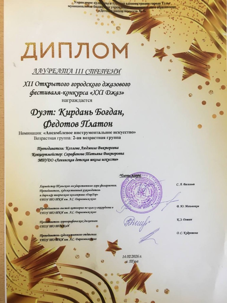 лауреат 3 ст.- дуэт: Кирдань Богдан и Федотов Платон (домра), преподаватель Козлова Л. В.