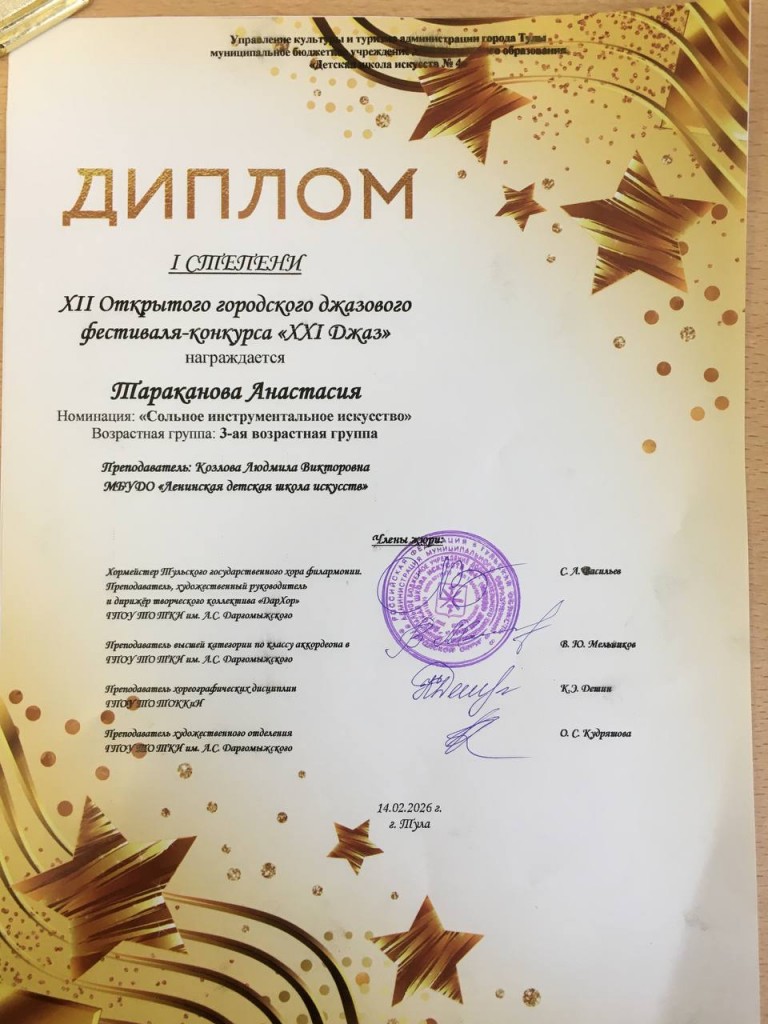 диплом 1 ст.- Тараканова Анастасия (гитара), преподаватель Козлова Л. В.
