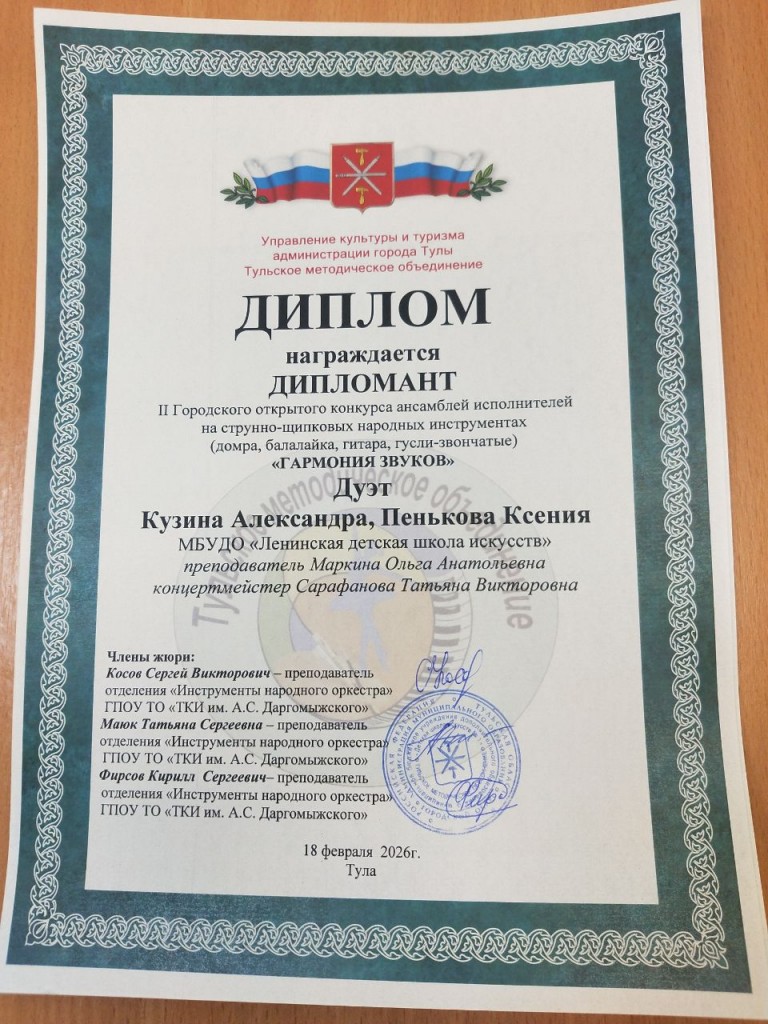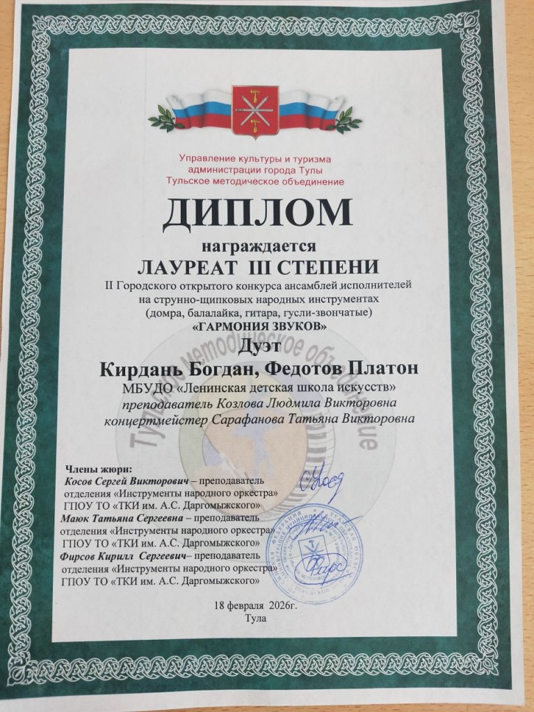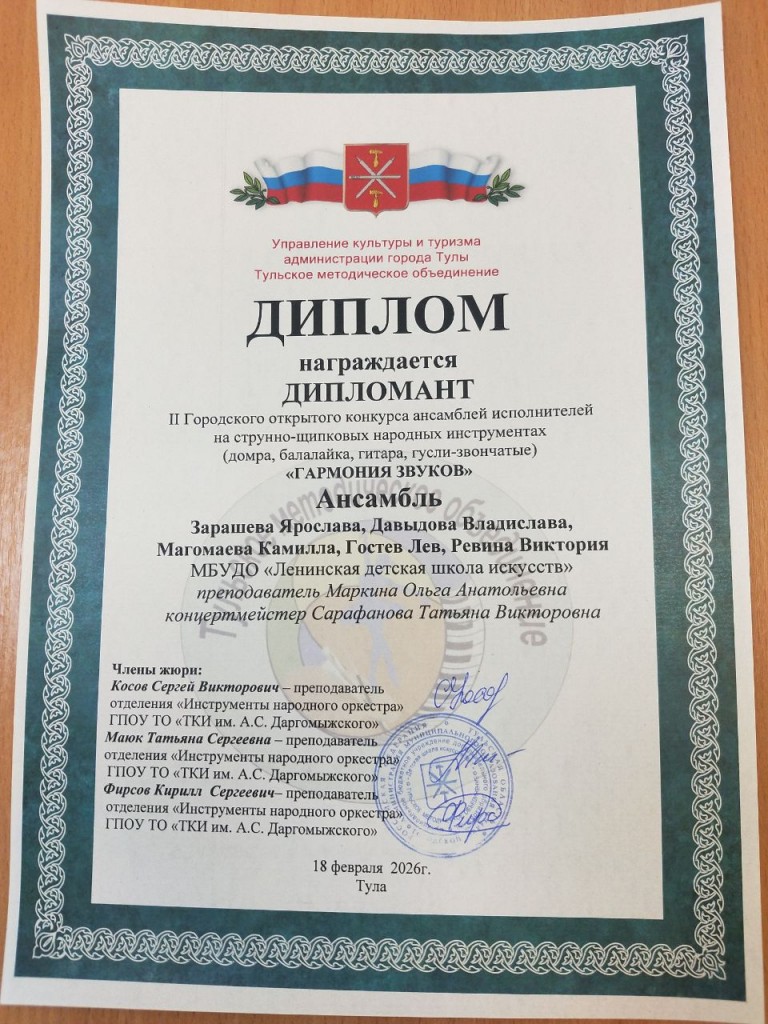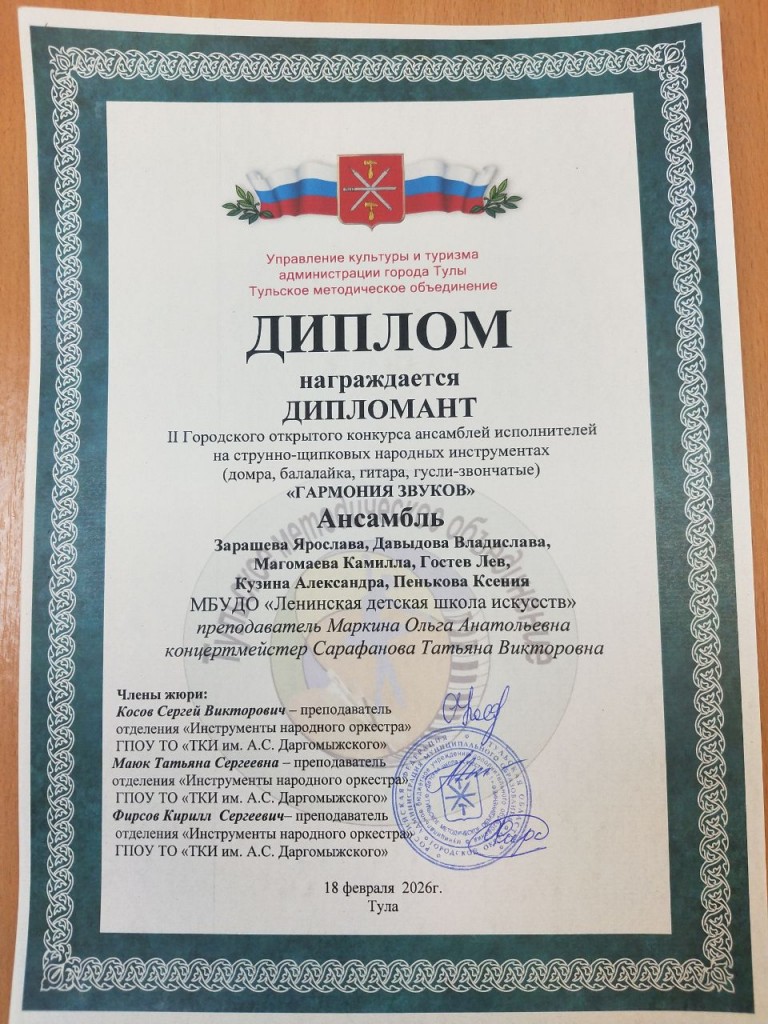 18 февраля 2026 года состоялся II городской открытый конкурс ансамблей исполнителей на струнно-щипковых инструментах (домра, балалайка, гитара, гусли- звончатые) «Гармония звуков».