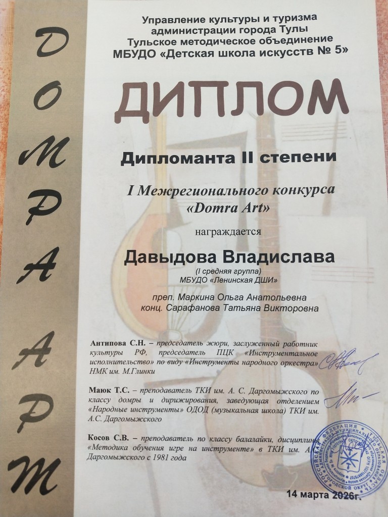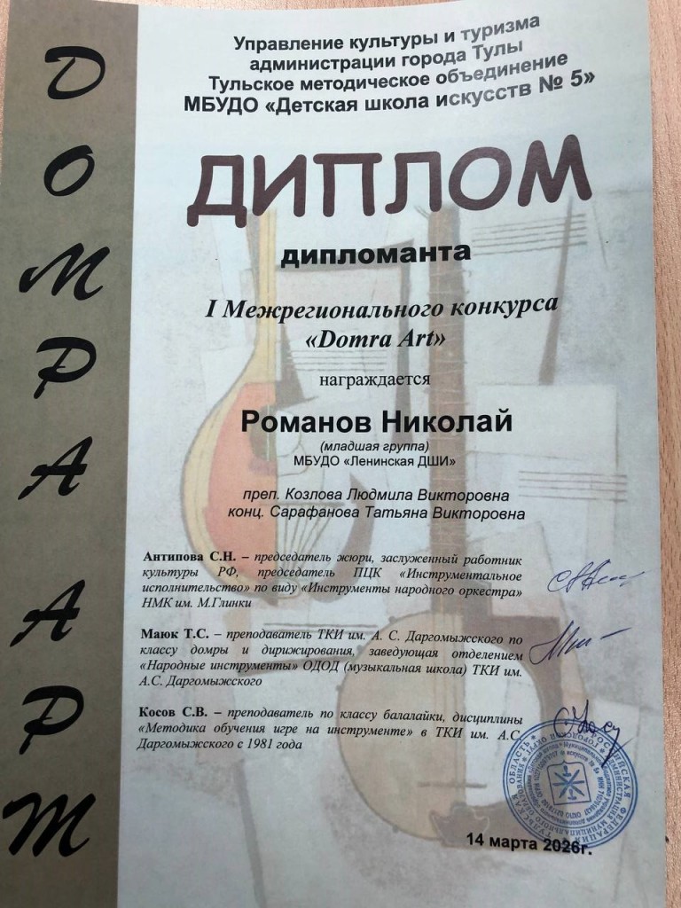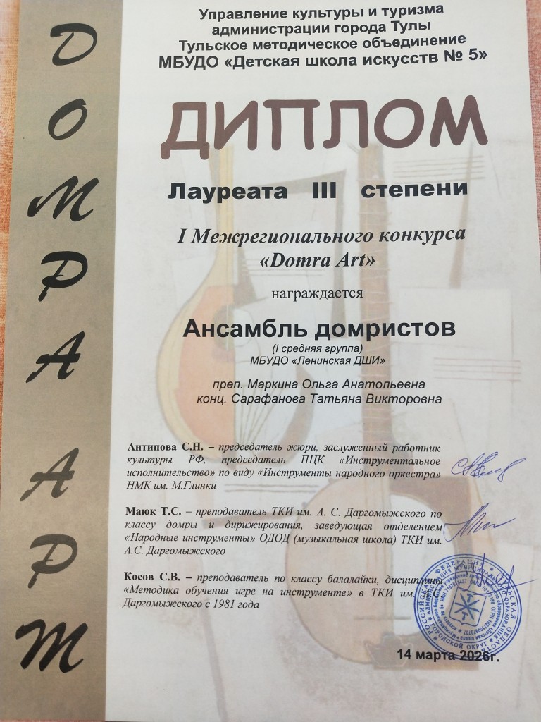 Поздравляем учащихся класса домры с победой во I Межрегиональном конкурсе «Domra Art»: