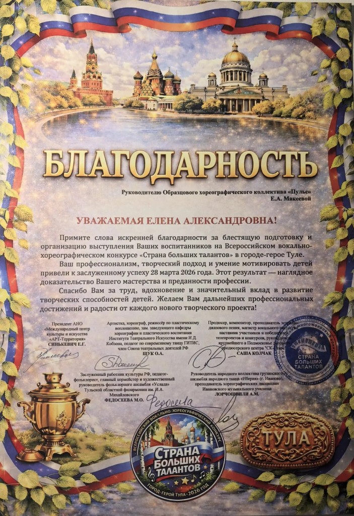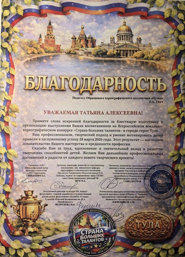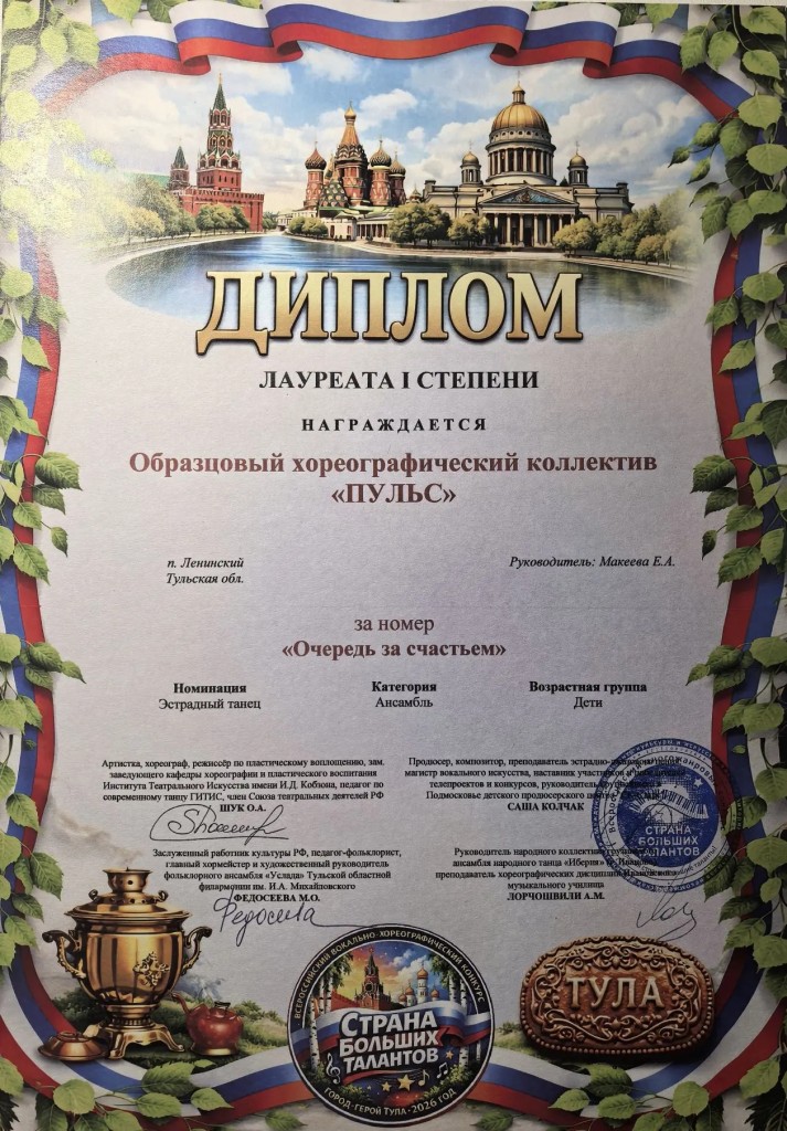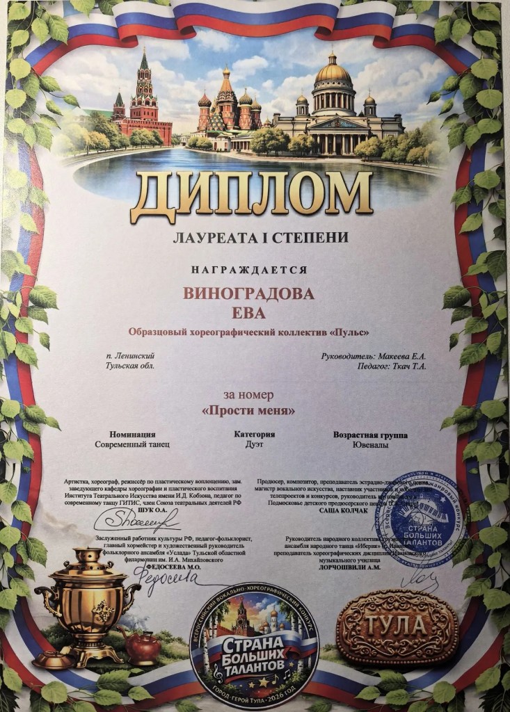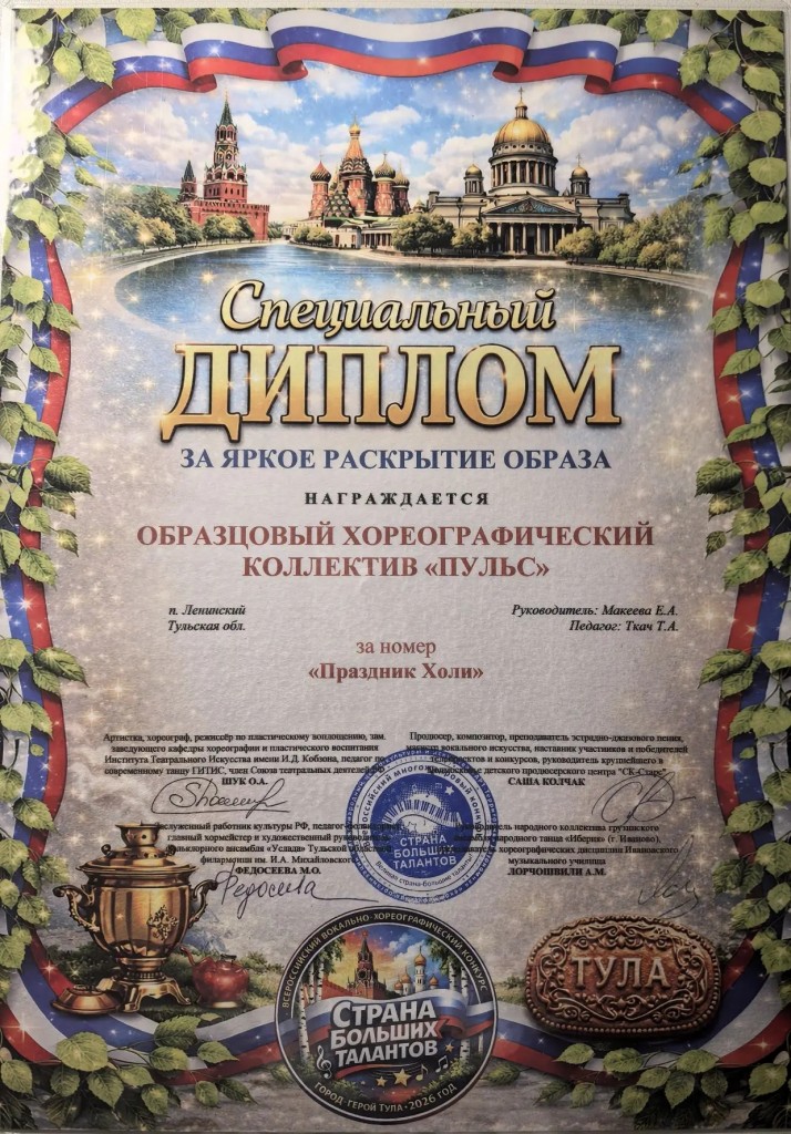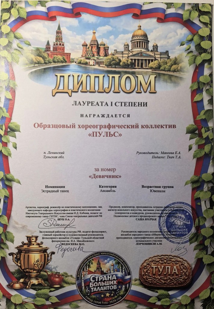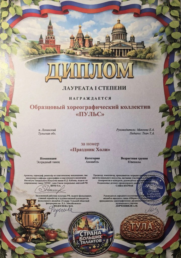 28 марта Образцовый хореографический коллектив "Пульс" (рук. Макеева Е.А.,преп.Ткач.Т.А.) триумфально выступил на Всероссийском конкурсе "Страна больших талантов" г. Тула.