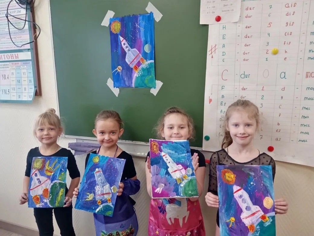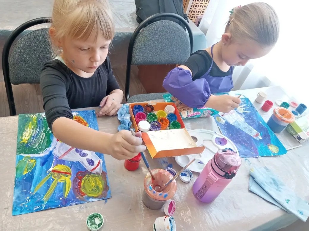 Ребята рисовали звёздное небо с планетами, по которому летит космический корабль.
