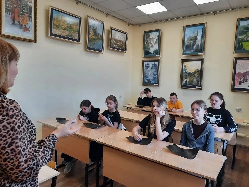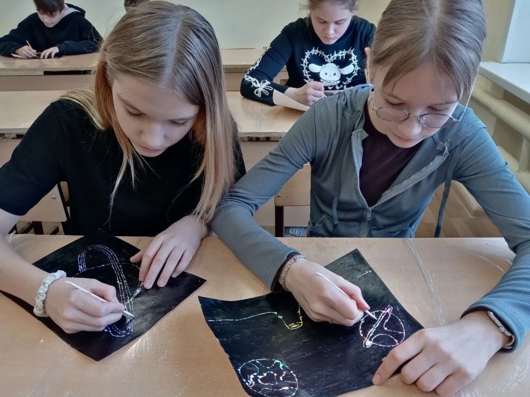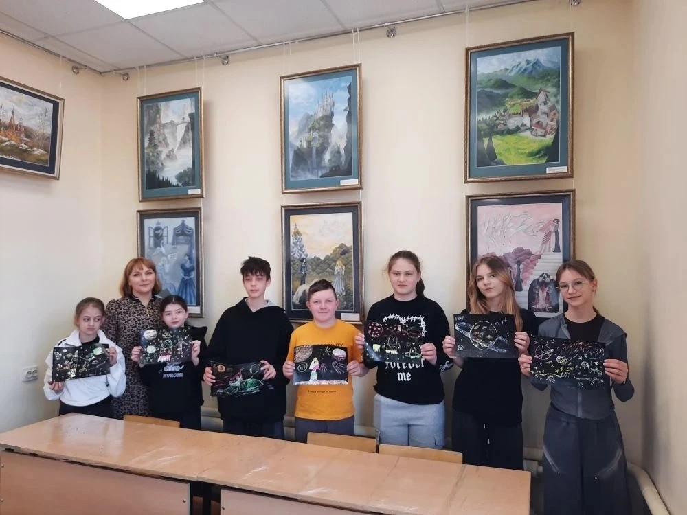 Преподаватель художественного отделения нашей школы Муратова Анна Владимировна провела мастер- класс "Здравствуй, космос!" для учащихся 6 класса МБОУ ЦО N 46.