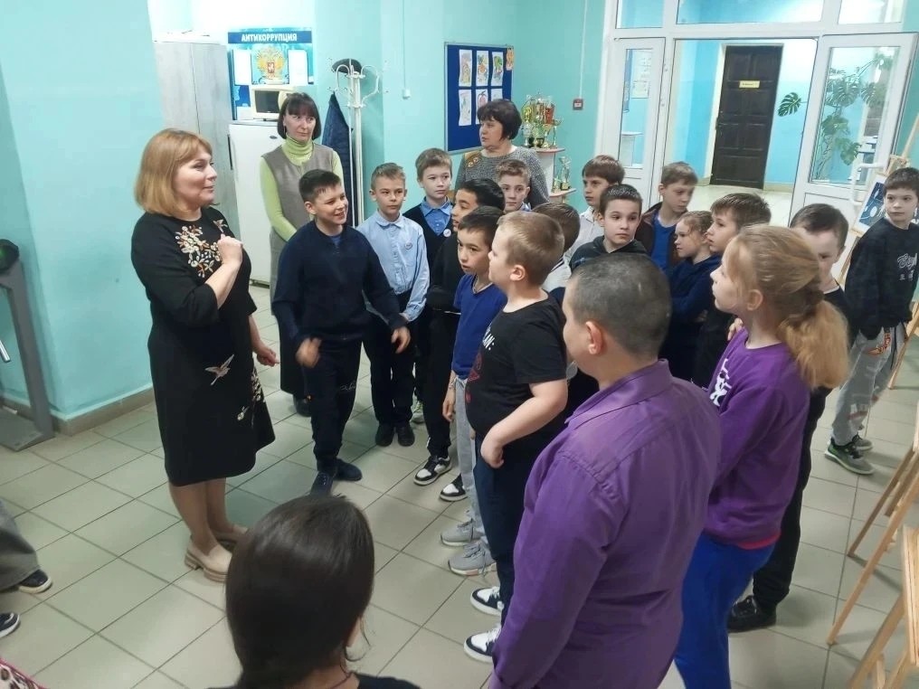 Преподаватель художественного отделения Муратова Анна Владимировна рассказала ребятам о представленных художественных работах учащихся нашей школы.