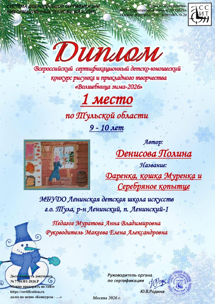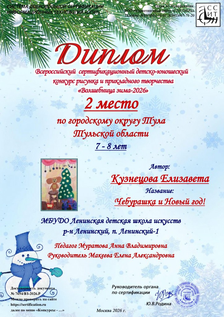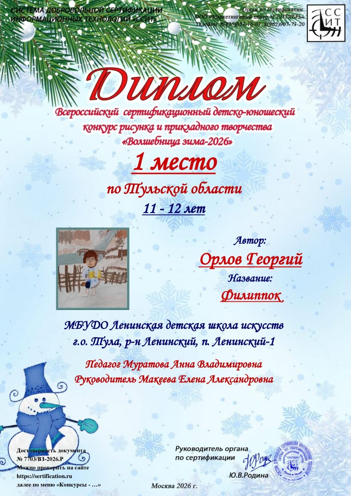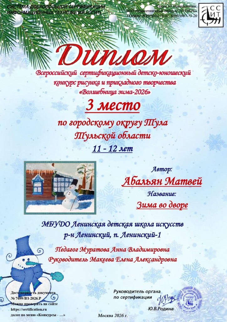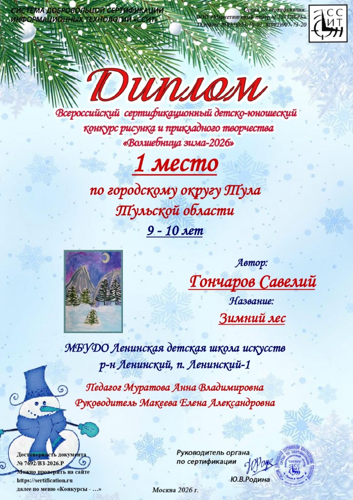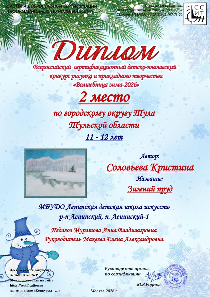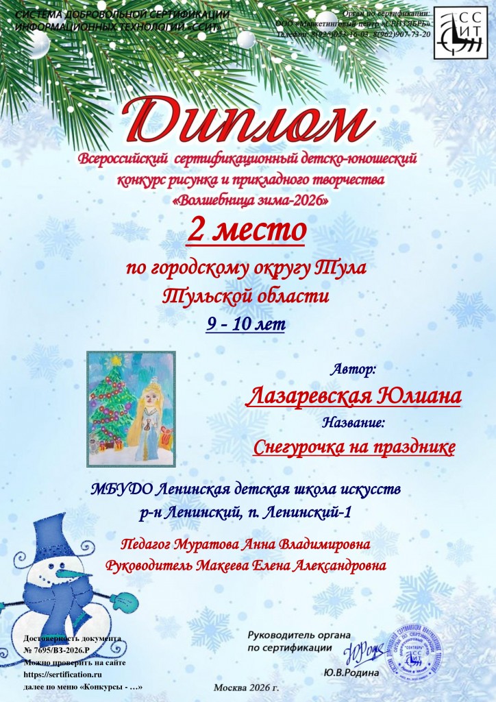 Поздравляем учащихся художественного отделения МБУДО «ЛДШИ» (преп.Муратова Анна Владимировна) с победой в Всероссийском сертифицированном детско-юношеском конкурсе рисунка и прикладного творчества «Волшебница зима-2026» г.Москва: