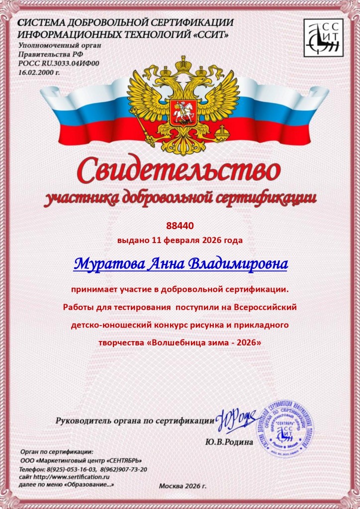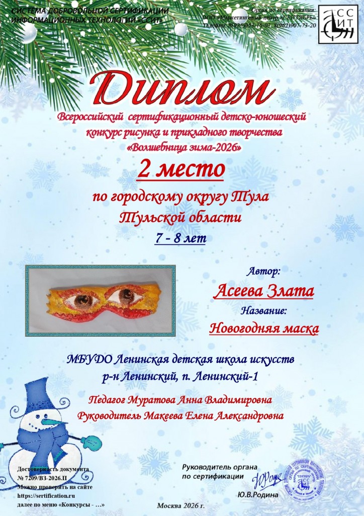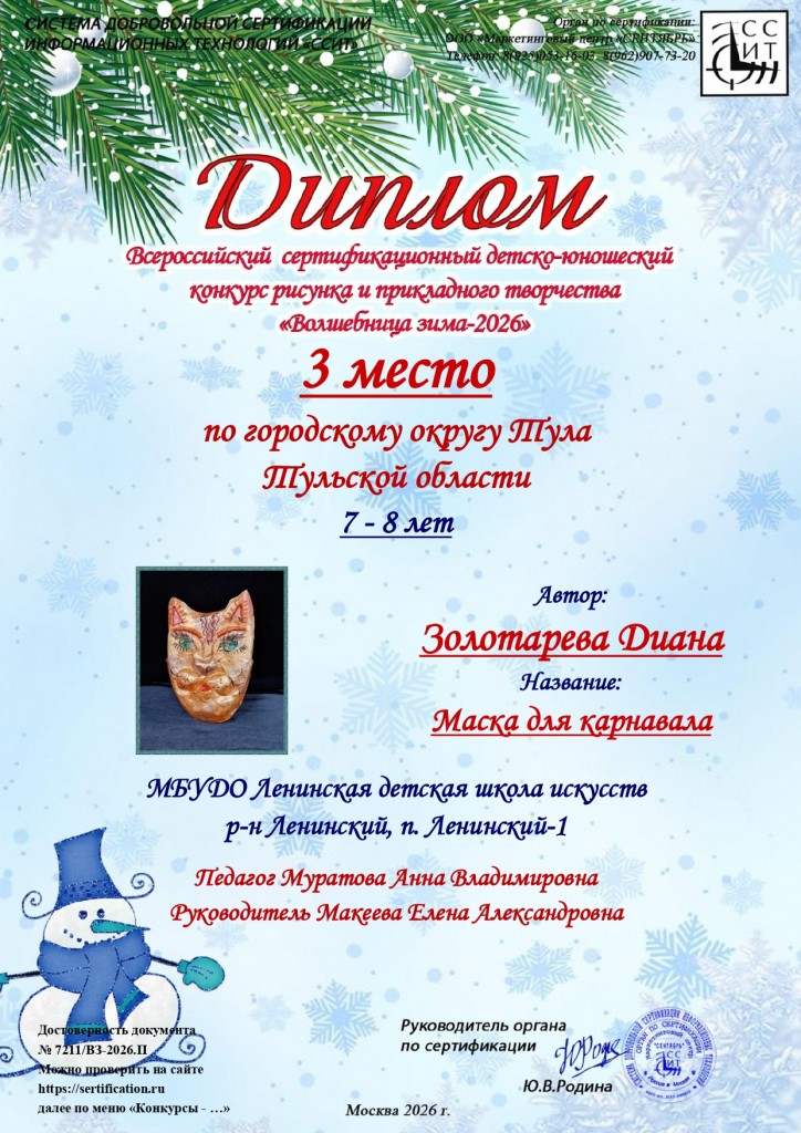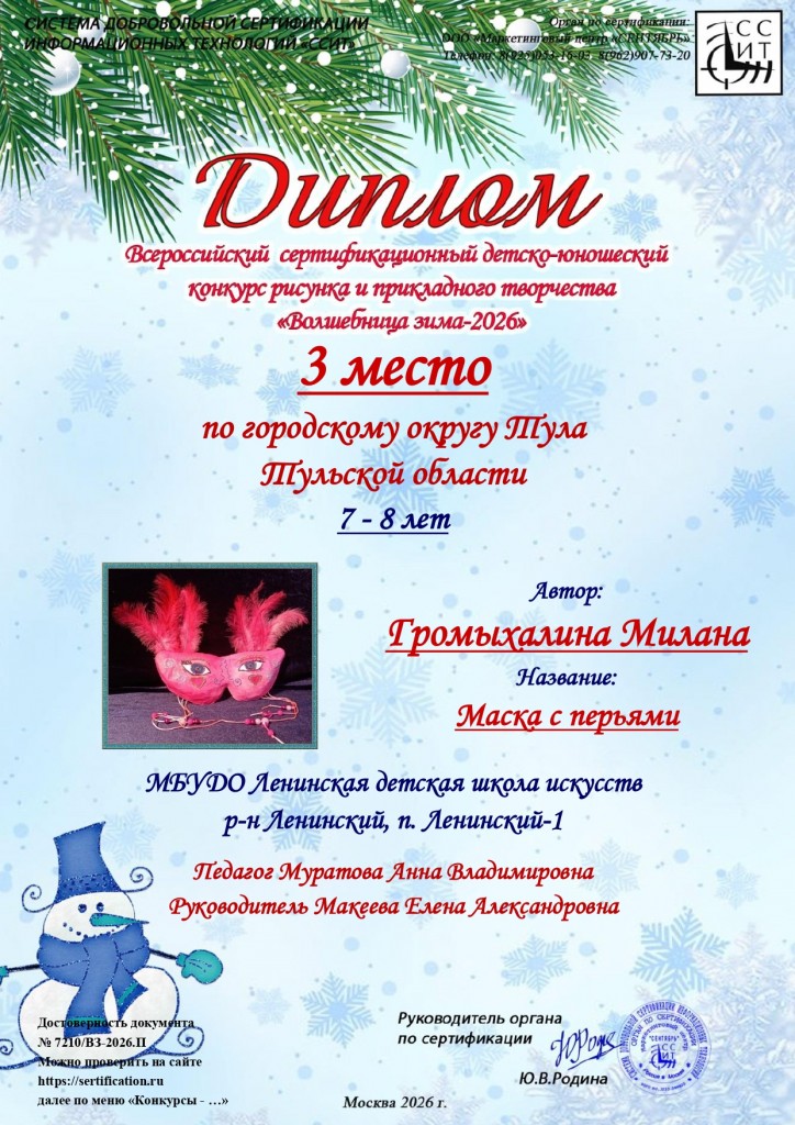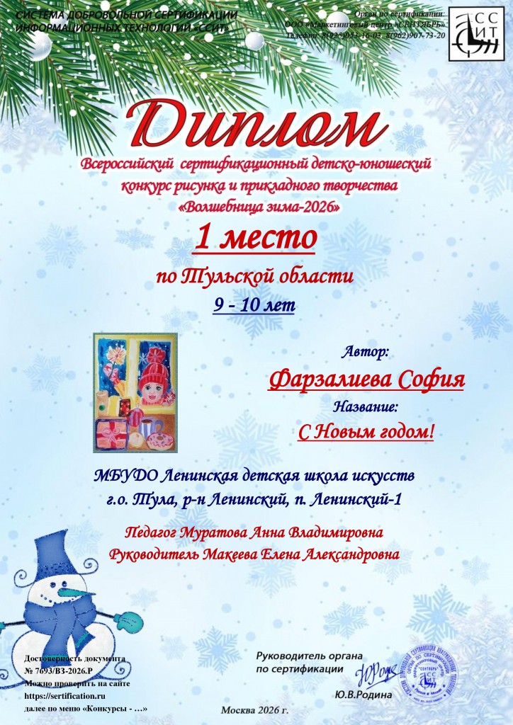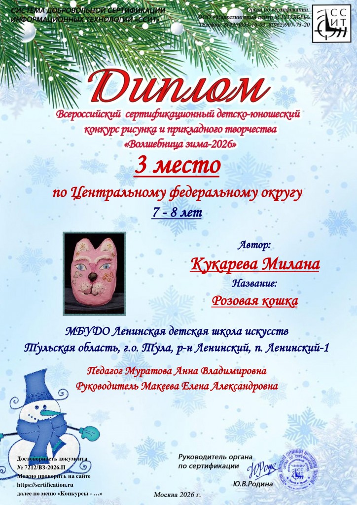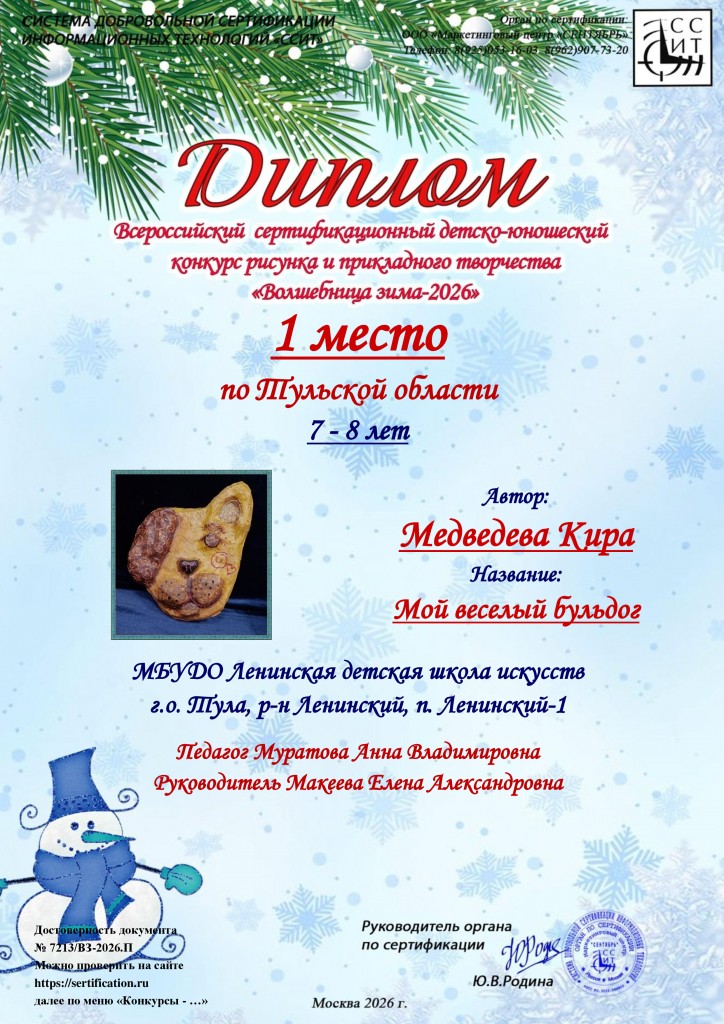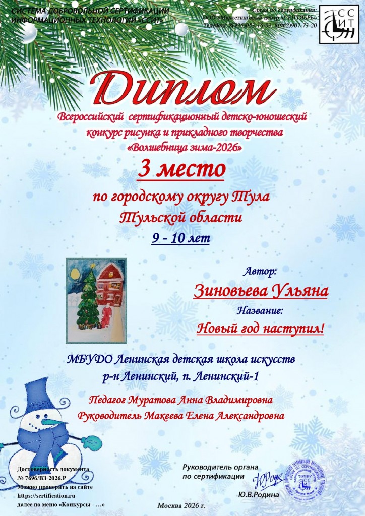 Поздравляем учащихся художественного отделения МБУДО «ЛДШИ» (преп.Муратова Анна Владимировна) с победой в Всероссийском сертифицированном детско-юношеском конкурсе рисунка и прикладного творчества «Волшебница зима-2026» г.Москва: